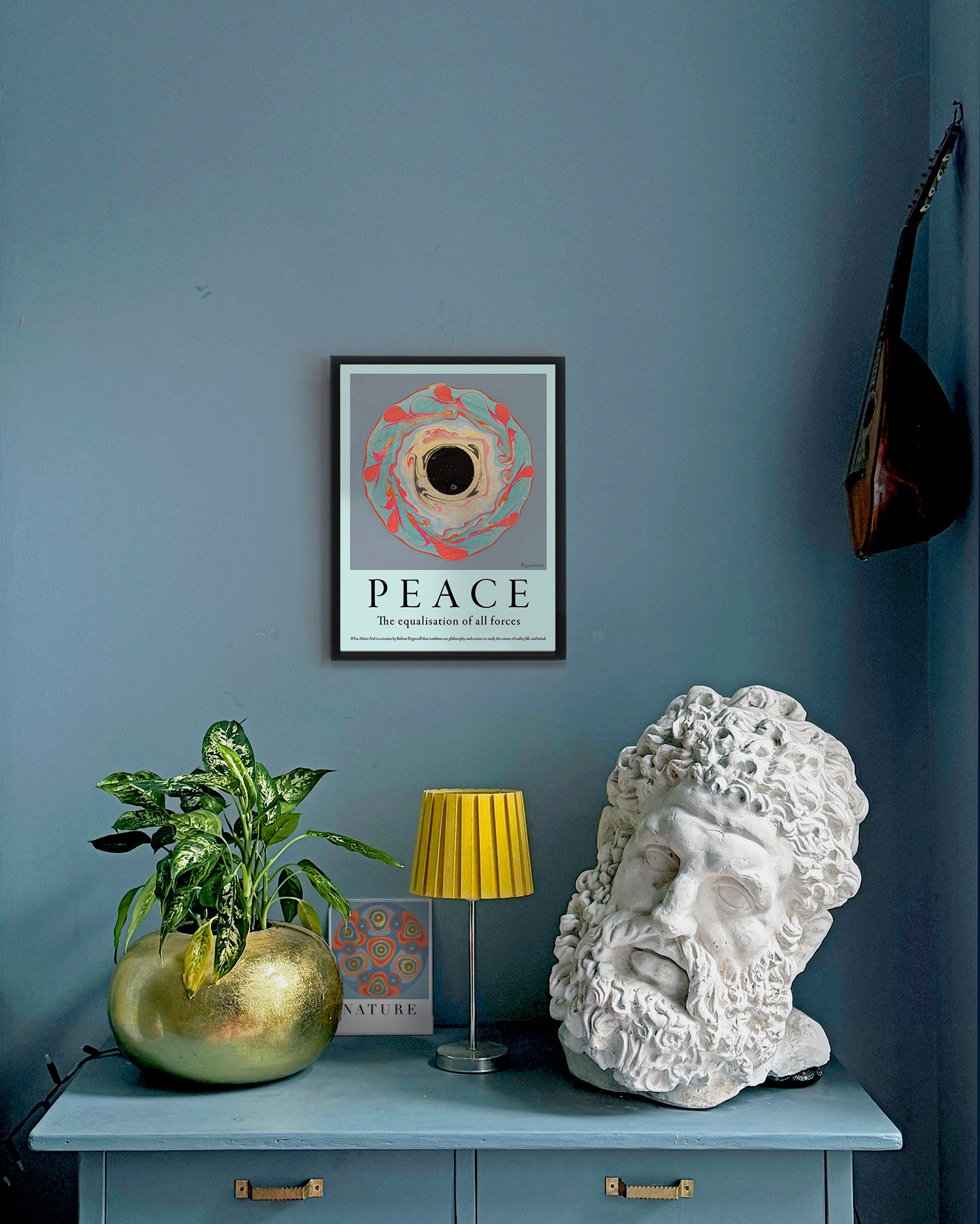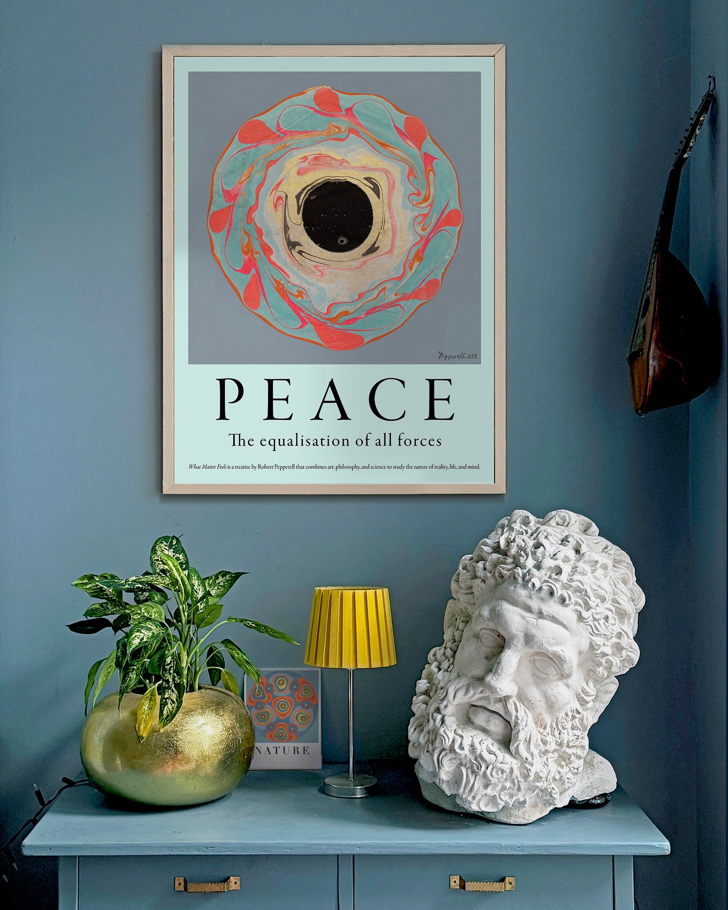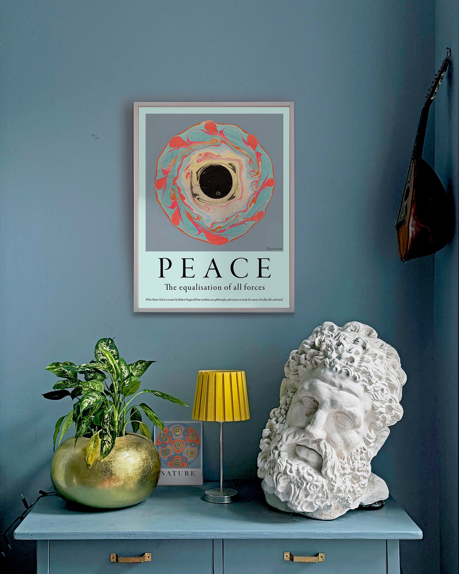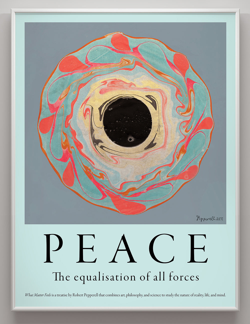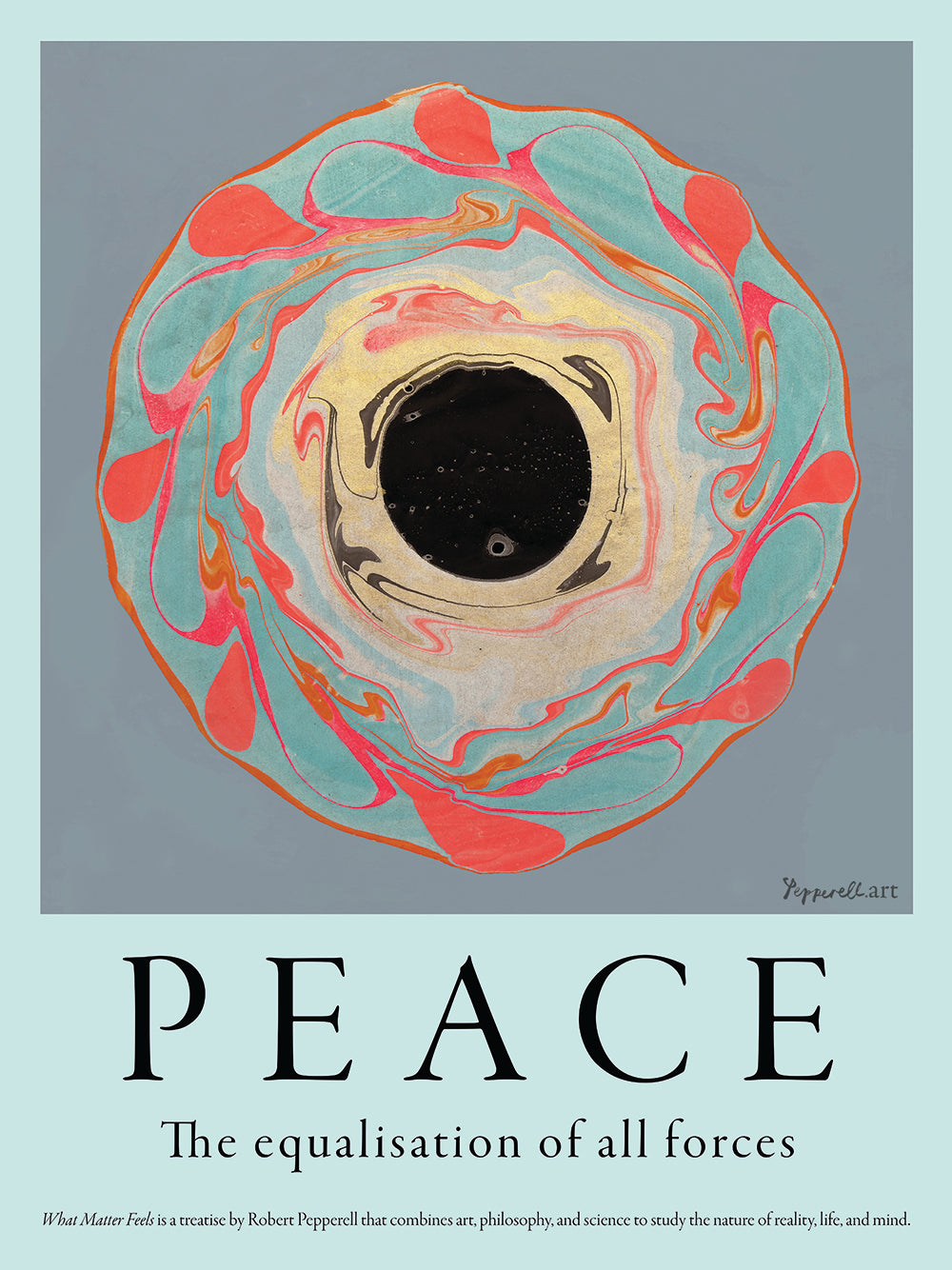 The image in this work uses metallic pigments alongside more traditional inks and paints in the marbling process. The metallic pigment is notoriously difficult to work with as it tends not to stick well to the paper and sometimes the most satisfying compositions are lost during the final washing process. In this case, the lustre of the gold pigment contrasts highly with the deep black at the centre of the vortex which, on close inspection, contains a miniature cosmos.